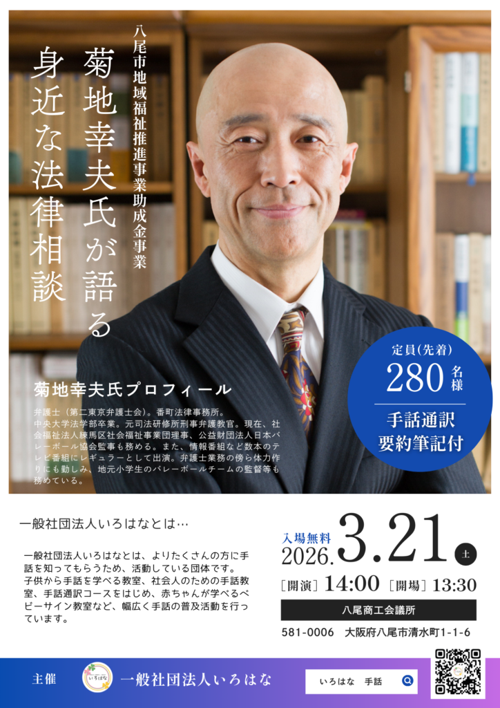 2026年1月28日 / 最終更新日時 : 2026年1月28日 irohana-osaka お知らせ 講演会開催「菊地幸夫氏が語る身近な法律相談」 第2回いろはな講演会を開催します。ぜひご参加ください。 Follow me!